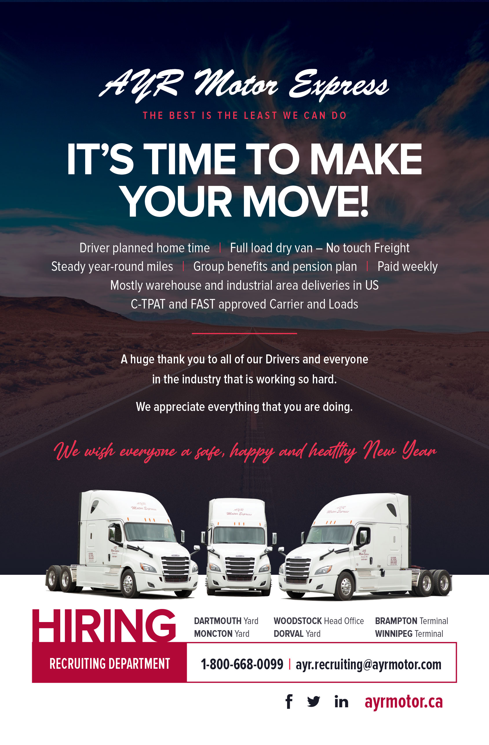 If you are looking to make good money and willing to work smart, then AYR Motor Express is the right place for you. Here you can be assured of staying busy with ample mileage and use of late Model equipment, along with regular home time.