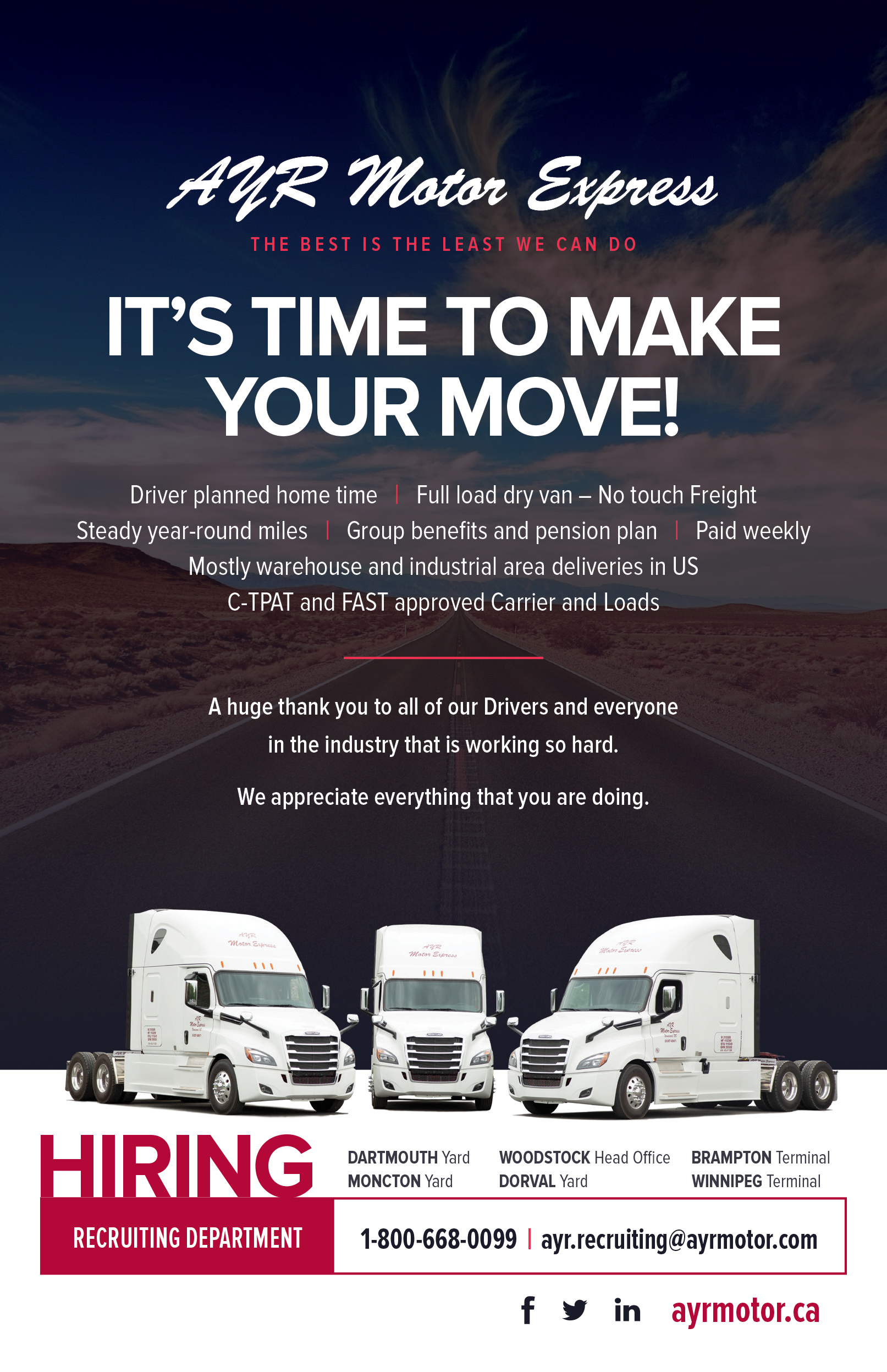 If you are looking to make good money and willing to work smart, then AYR Motor Express is the right place for you. Here you can be assured of staying busy with ample mileage and use of late Model equipment, along with regular home time.